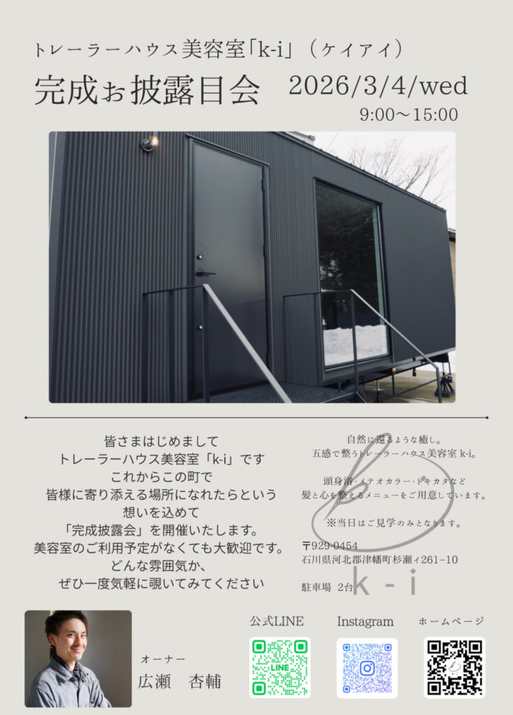 2026年3月4日 9時〜15時、「k-i」の完成お披露目会を開催したいと思います。