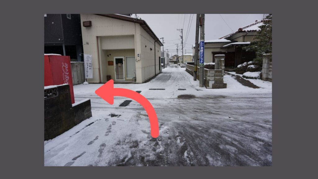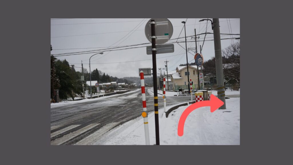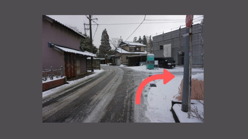 少しすすむと、やや大きめな交差点がありますので、ここを右に曲がっていただきます